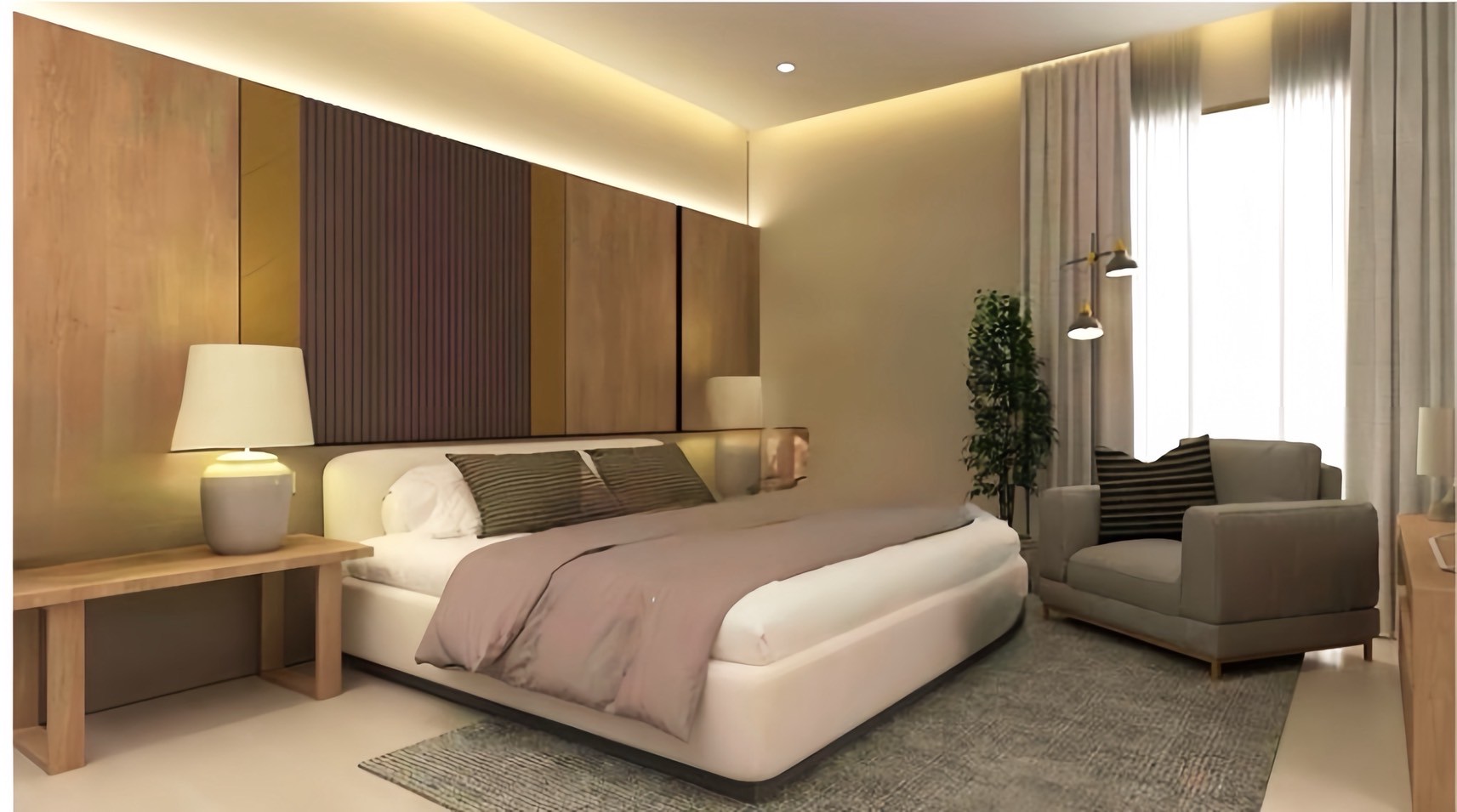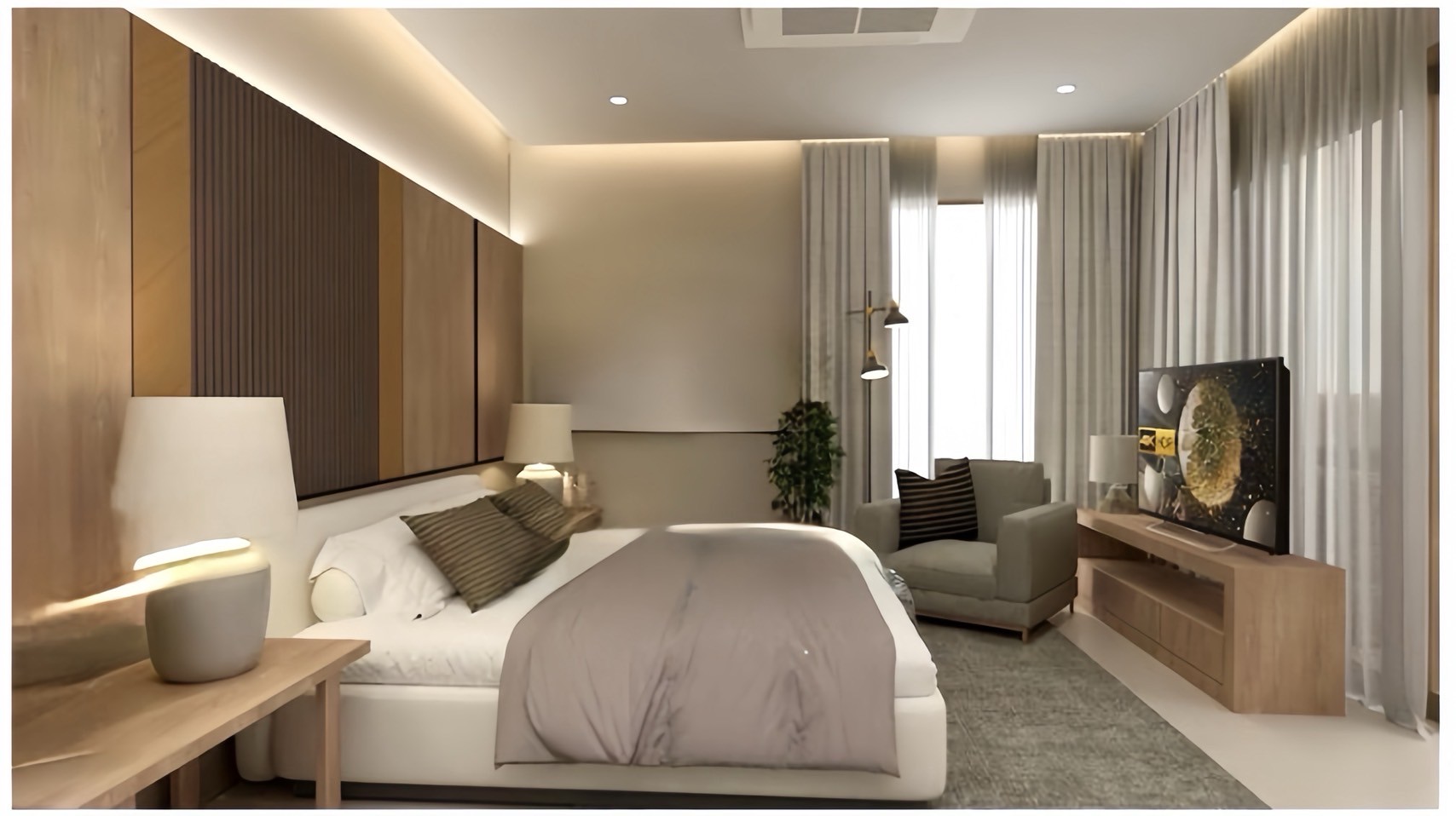 Bedroom receives natural light With private swimming pool Outdoor space connects families Evening parties,