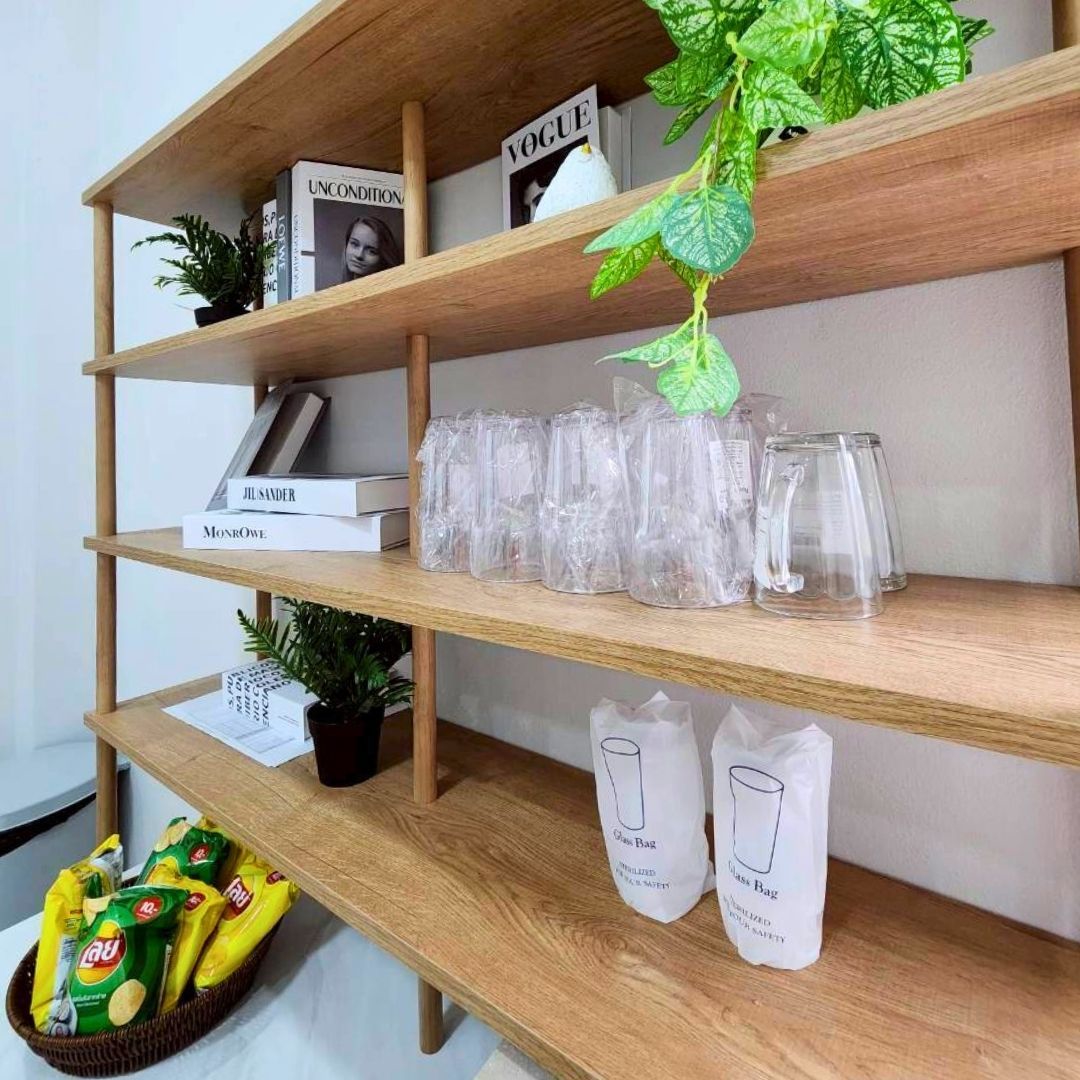 ครัวพร้อมอุปกรณ์ครบครัน: ไมโครเวฟ ตู้เย็น หม้อหุงข้าว หม้อไฟฟ้า เครื่องปิ้งขนมปัง